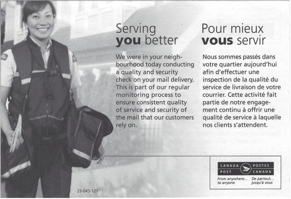 My biggest and in fact only beef with Canada Post is how often they provide misleading and incorrect information to the public. For example, an item which typically arrives on a Wednesday is delayed until Friday. On Friday Canada Post email states the item is now due to arrive. Yet normal delivery comes and no item. It’s not in the mail slot, no key is left for you to get the item, and nobody shows up at your door. After you wait about 90 minutes more and then call Canada Post with your tracking #, they tell you the item could still arrive by 8 pm. Yet these items are delivered consistently when the mailman delivers the mail (the size and weight of item does not vary so has no bearing on mode of delivery).